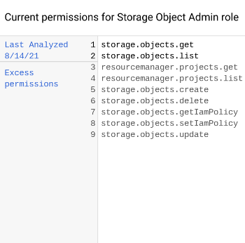 Pour vous aider à comprendre pourquoi la recommandation a été émise, la consoleGoogle Cloud affiche l'utilisation des autorisations du compte principal, comme indiqué par l'insight sur les stratégies associé à la recommandation. Par exemple, une liste semblable à celle-ci peut s'afficher :