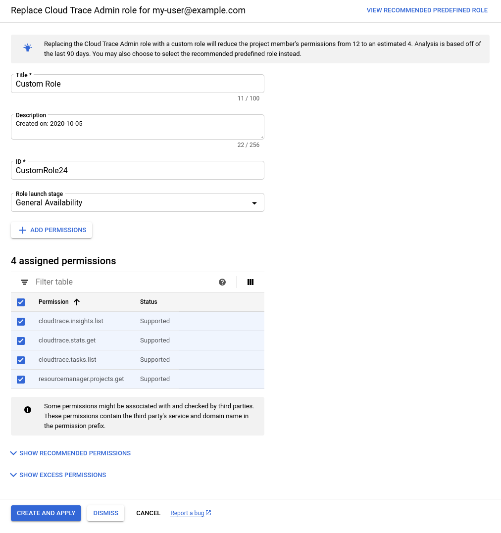 Daher generiert der IAM-Recommender eine Rollenempfehlung, die empfiehlt, dass Sie eine benutzerdefinierte Rolle erstellen, die nur die Berechtigungen enthält, die my-user@example.com tatsächlich verwendet hat: