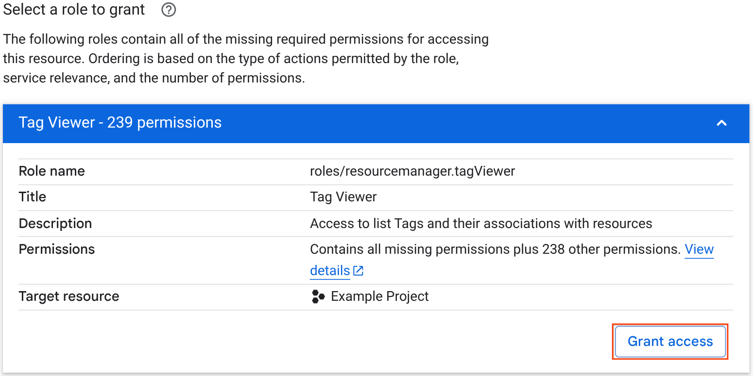 Di bagian Minta peran tertentu, tinjau daftar peran yang direkomendasikan dan pilih peran yang ingin Anda minta. Anda dapat mengklik peran untuk melihat detail selengkapnya. Bagian ini hanya terlihat jika kesalahan izin disebabkan oleh kebijakan izinkan.