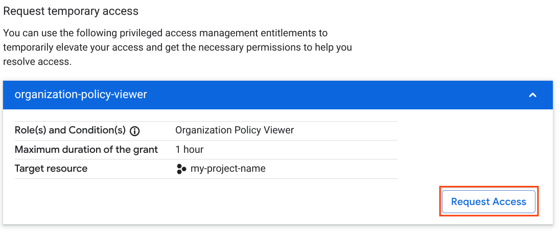 Quando visualizzi un messaggio di errore, individua la sezione Richiedi accesso temporaneo. Questa sezione elenca tutti i diritti di Privileged Access Manager che contengono un ruolo con le autorizzazioni richieste.