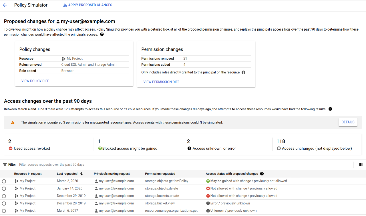 To get the most complete results from a simulation, we recommend that you have certain IAM and Google Workspace permissions. If you don't have some or all of these permissions, you can still run a simulation. However, running a simulation without these permissions could result in an increased number of unknown access changes, because you might not be able to retrieve information that could impact the results of the simulation.