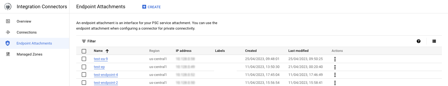 { "name": "projects/demo-project/locations/us-central1/endpointAttachments/demo-ea", "createTime": "2023-04-17T04:34:59.569527046Z", "updateTime": "2023-04-17T04:37:25.189074195Z", "description": "demo endpoint attachment", "serviceAttachment": "projects/demo-project/regions/us-central1/serviceAttachments/demo-sa", "endpointIp": "10.0.0.0", "labels": {"team":"sre"}, }엔드포인트 연결의 IP 주소는