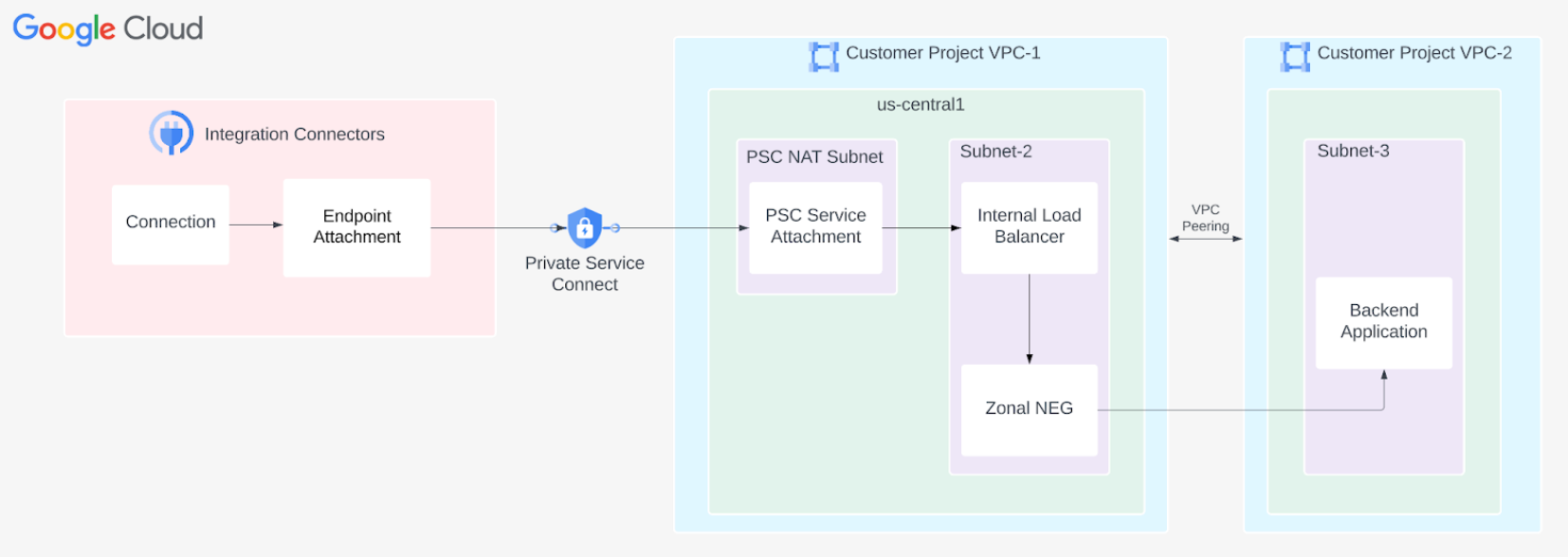- Alle Ihre Google Cloud-Komponenten, z. B. der PSC-Dienstanhang und der Load Balancer, sollten sich in derselben Region befinden.