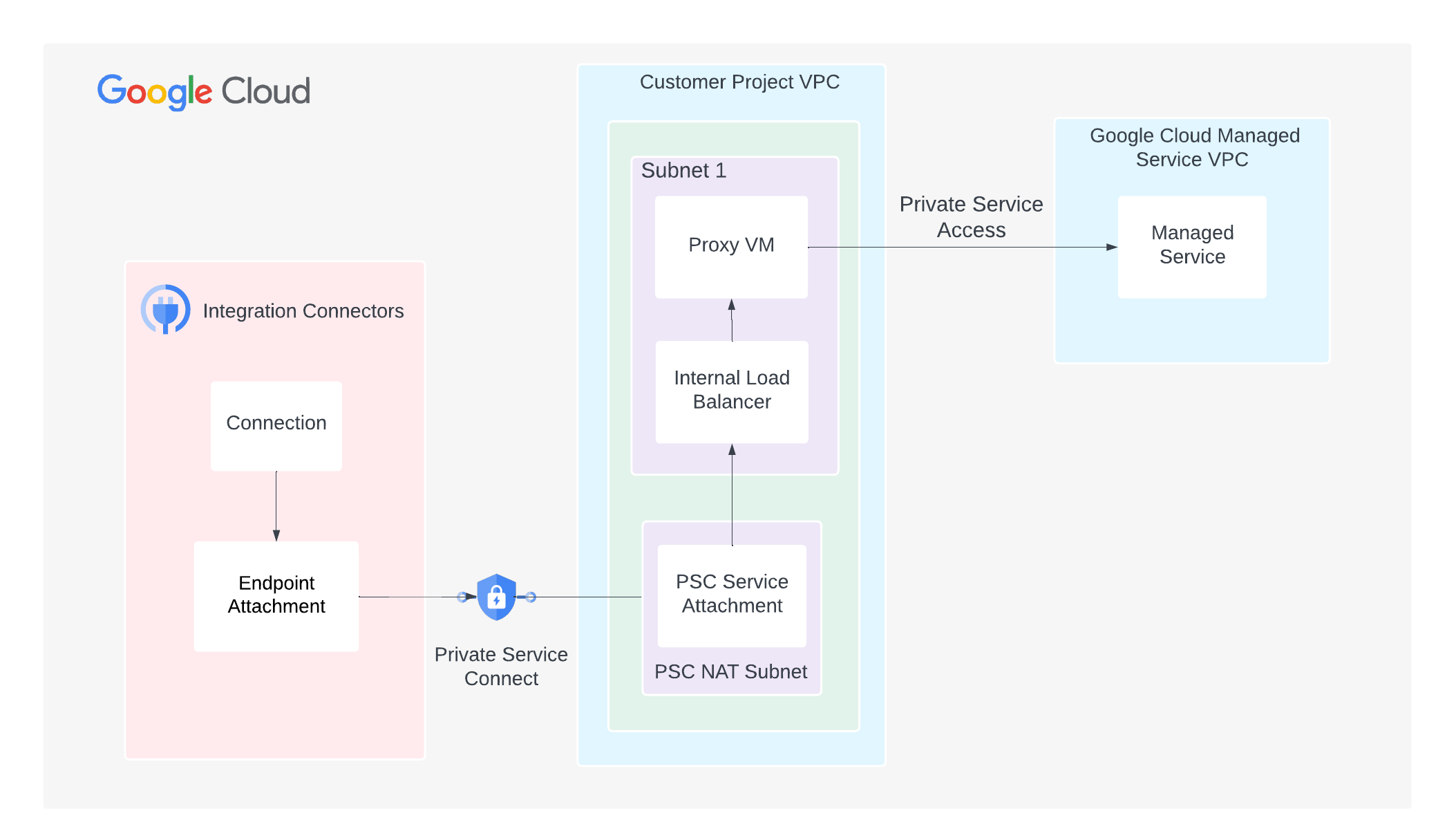 Beberapa layanan Google Cloud terkelola seperti CloudSQL MySQL mengekspos lampiran layanan PSC untuk konektivitas pribadi. Dalam kasus tersebut, Anda dapat melewati langkah ini untuk membuat lampiran layanan PSC, dan lampiran layanan PSC yang disediakan oleh layanan terkelola yang disediakan dapat digunakan untuk membuat lampiran endpoint Konektor Integrasi.