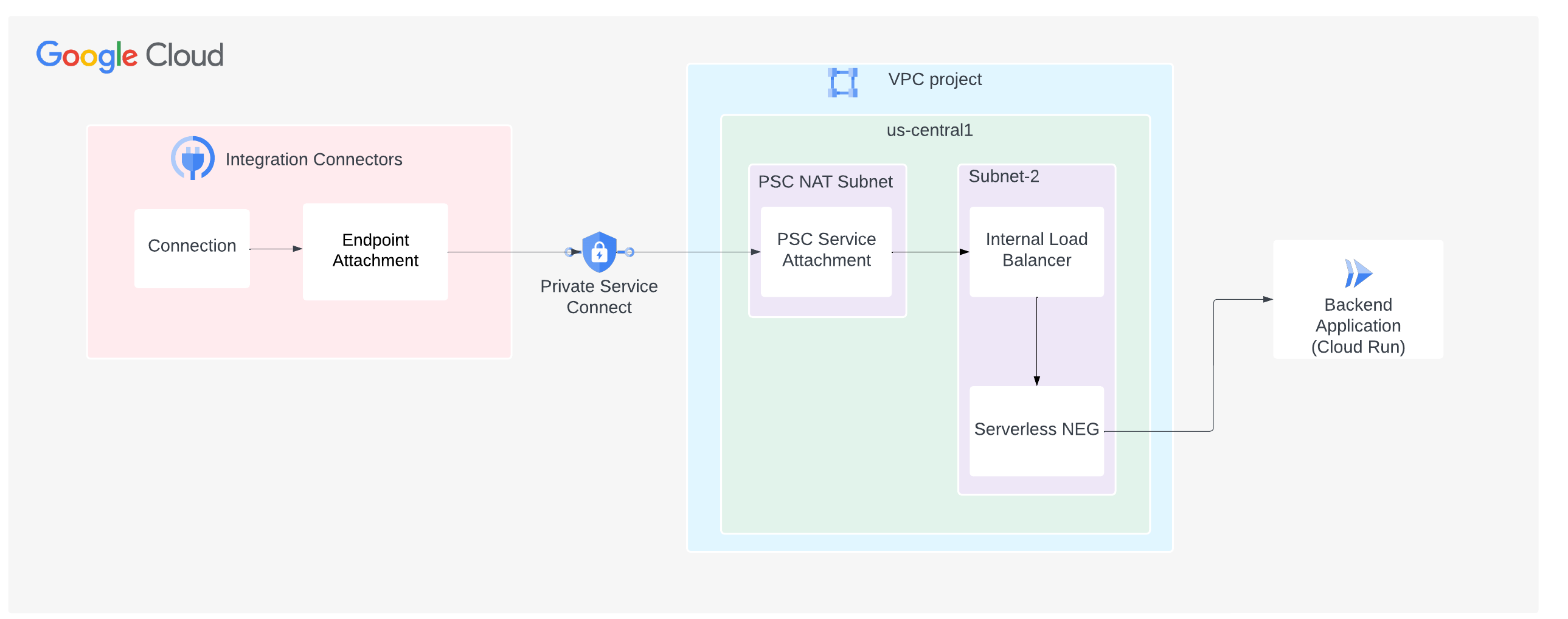 Damit eine private Verbindung von Integration Connectors hergestellt werden kann, muss Ihr Dienst über einen PSC-Dienstanhang für Integration Connectors verfügbar gemacht werden. Für eine Dienstanwendung wird immer ein Load Balancer verwendet. Wenn Ihr Dienst also nicht hinter einem Load Balancer ausgeführt wird, muss ein Load Balancer konfiguriert werden.
