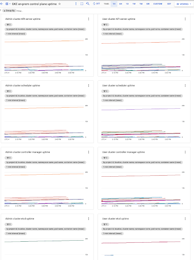 Pilih Resources > Dashboards dan lihat dasbor bernama GKE on-prem control plane uptime. Uptime bidang kontrol setiap cluster pengguna dikumpulkan dari namespace terpisah dalam cluster admin. Kolom namespace_name adalah nama cluster pengguna.