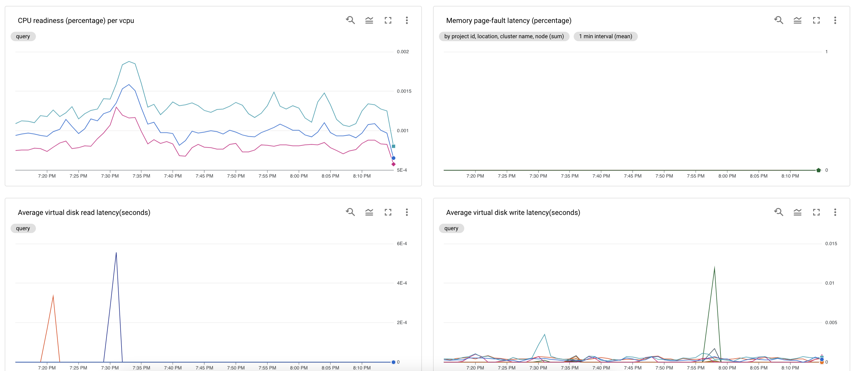 Dasbor status kondisi VM memantau sinyal persaingan resource CPU, memori, dan disk untuk VM di cluster admin dan cluster pengguna.