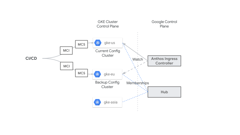 Controlador de Entrada de vários clusters: um plano de controle distribuído globalmente que é executado como um serviço fora dos clusters. Isso permite que o ciclo de vida e as operações do controlador sejam independentes dos clusters do GKE.