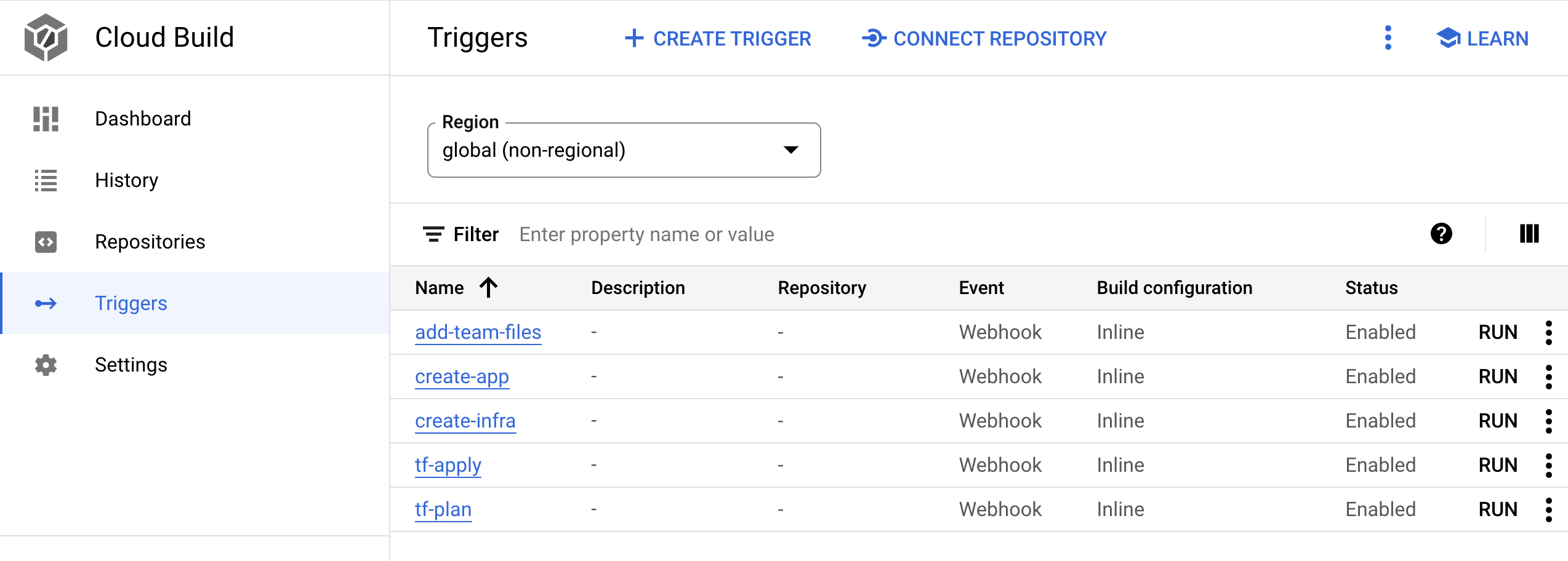 En esta sección, explorarás la canalización de infraestructura como código y la ejecutarás para crear la infraestructura compartida, incluidos los clústeres de GKE. La canalización es un activador de Cloud Build llamado create-infra en el proyecto Google Cloud que está vinculado al repositorio de infraestructura gke-infrastructure-repo. Debes seguir la metodología de GitOps para crear infraestructura como se explica en el video Entornos de GCP repetibles a gran escala con canalizaciones de infraestructura como código de Cloud Build.