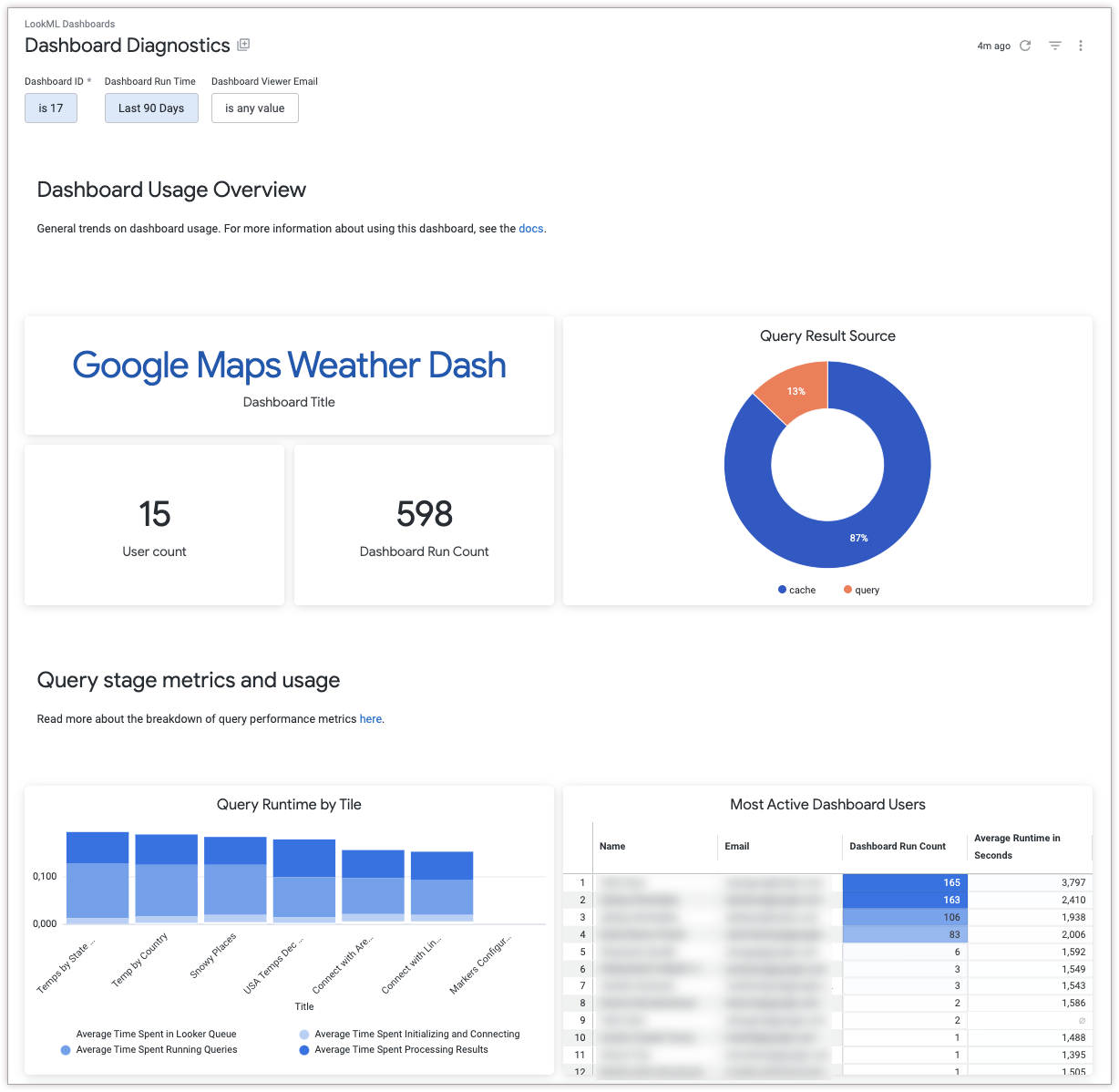 The Dashboard Diagnostics dashboard surfaces opportunities to improve performance on an individual dashboard.