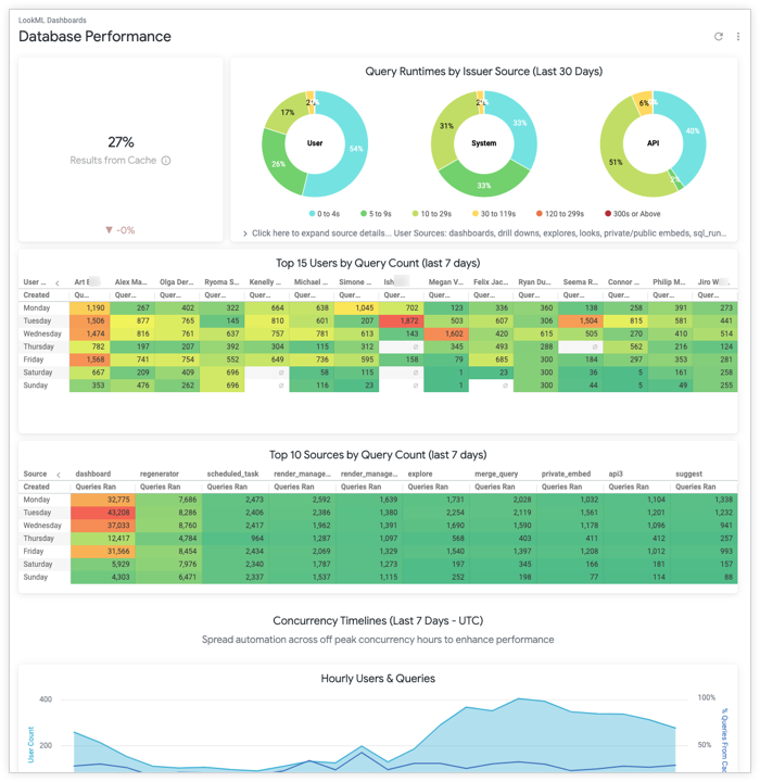 - The number of queries that were run, the number of active users, and the percentage of queries that were returned from the Looker cache for each hour of the day