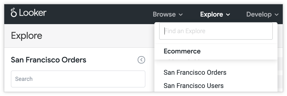 En este ejemplo, Looker muestra Usuarios de San Francisco y Pedidos de San Francisco en el menú Explorar y en los títulos de las Exploraciones, en lugar de las etiquetas predeterminadas Usuarios y Pedidos.