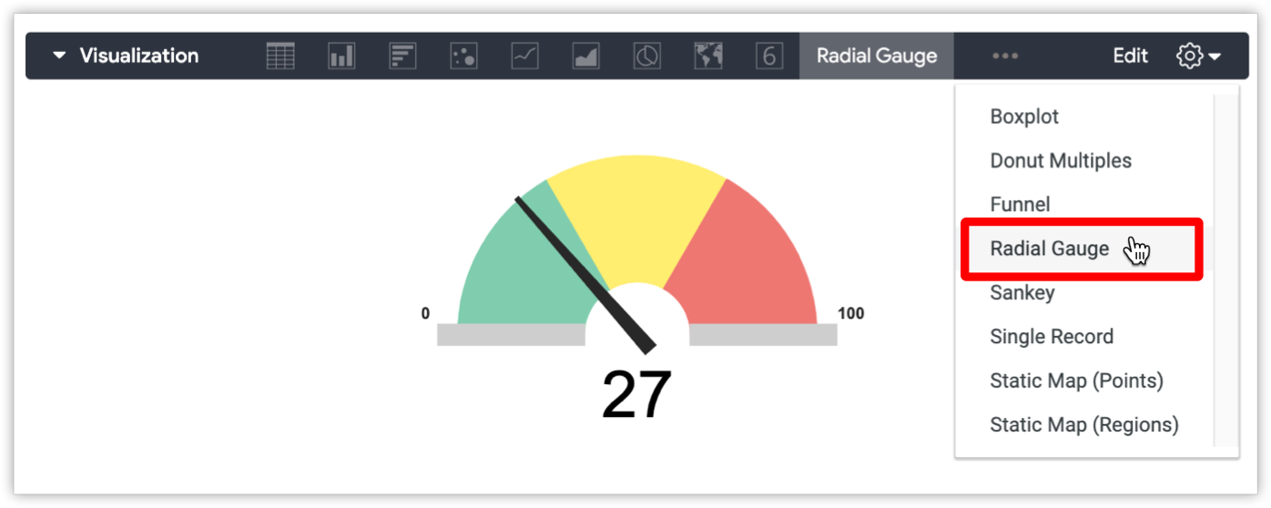 - 在專案的資訊清單檔案中,定義視覺化參數。舉例來說,這段 LookML 會將放射狀量表自訂視覺化圖表新增至 Looker 專案。視覺化效果是在 LookML 專案