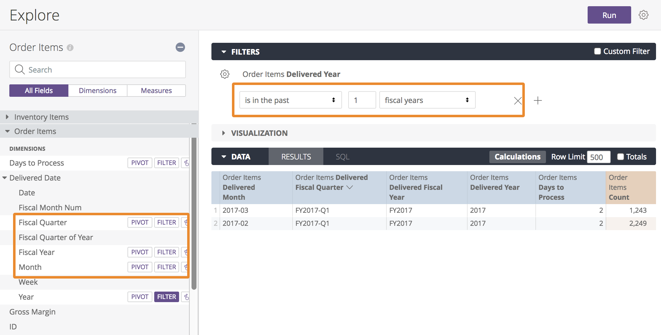 Anda juga dapat menggunakan referensi tanggal fiskal dalam jenis tanggal individual untuk dimensi dan filter. Namun, biasanya, menggunakan dimension_groups adalah praktik yang lebih baik.