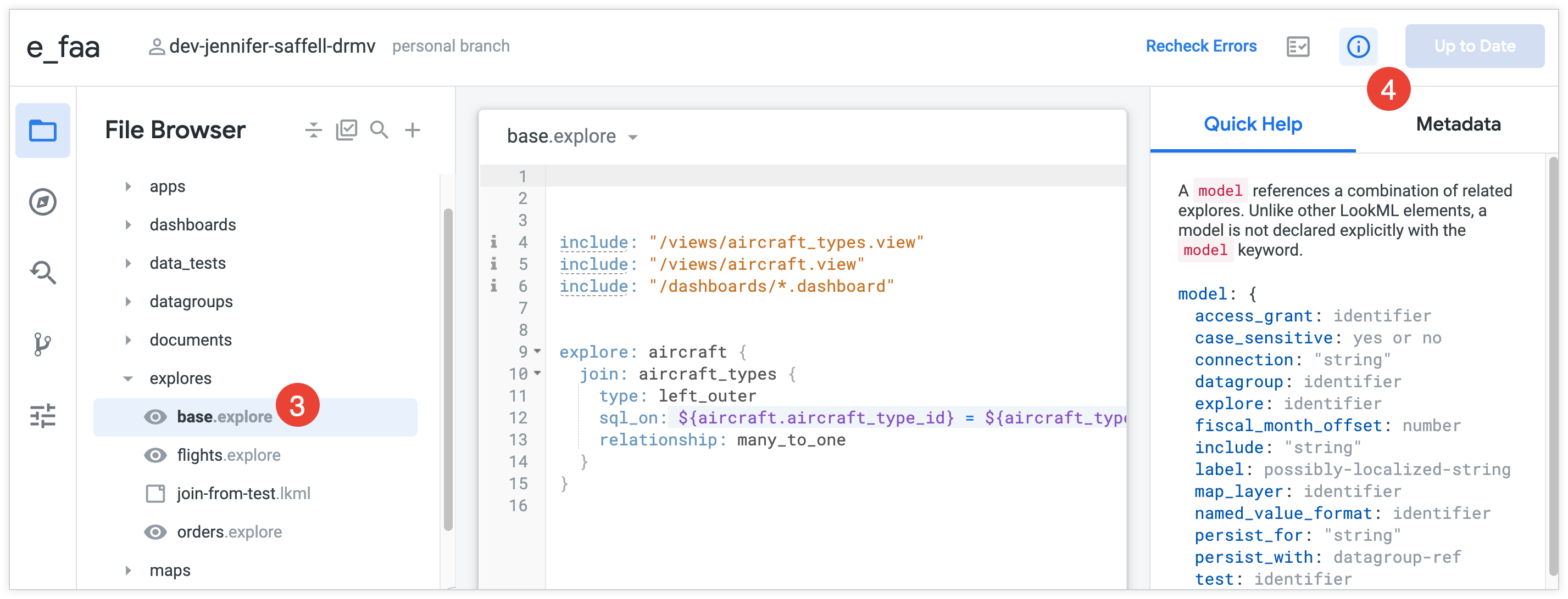 オブジェクト ブラウザ パネルを使用すると、プロジェクト内のすべてのオブジェクトを表示したり、特定のオブジェクトの LookML に移動したりできます。オブジェクト ブラウザ パネルを使用するには: