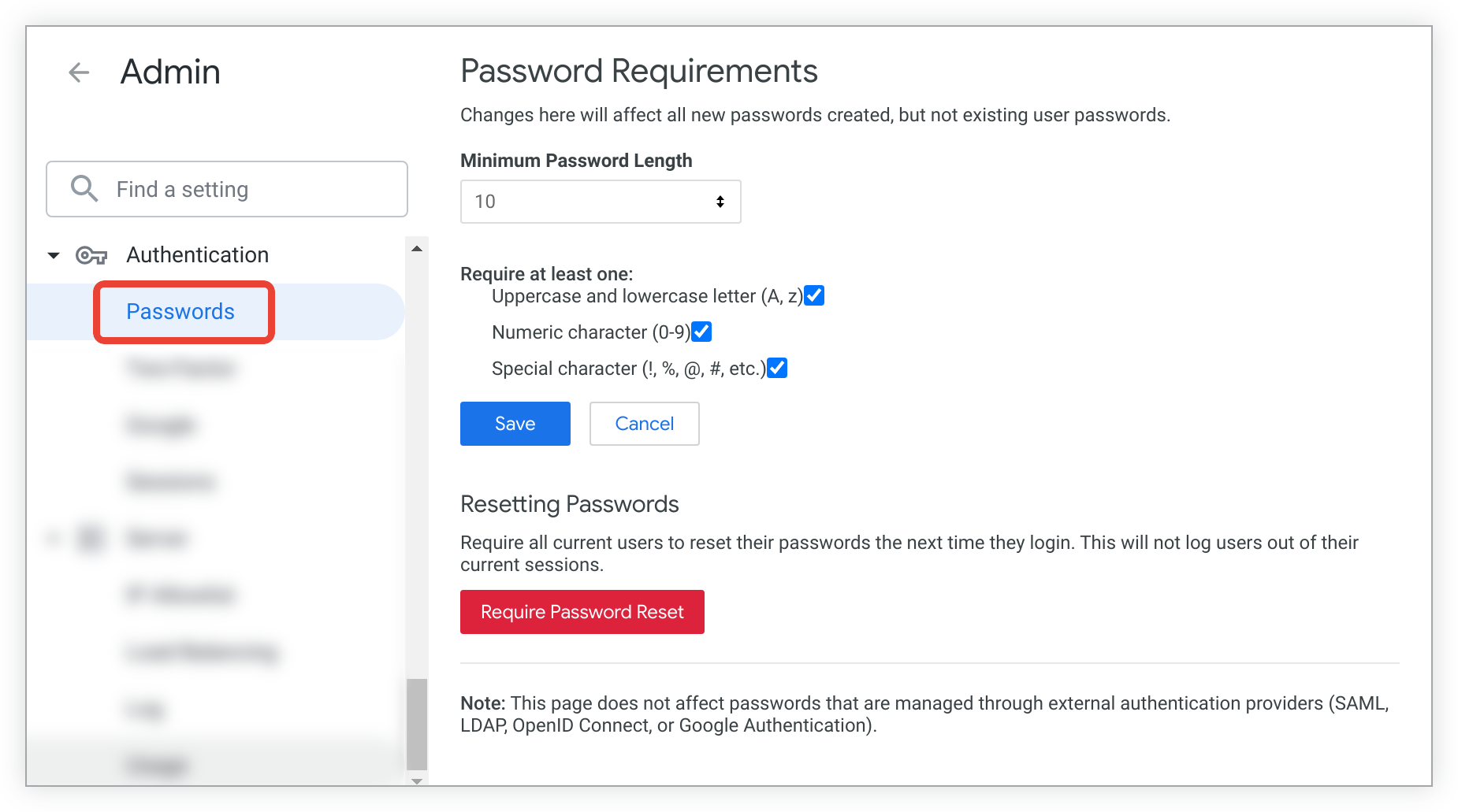 Los ajustes de requisitos de complejidad de las contraseñas no tienen ningún efecto en las contraseñas alojadas en sistemas de autenticación externos (SAML, LDAP, autenticación de Google y OpenID Connect).