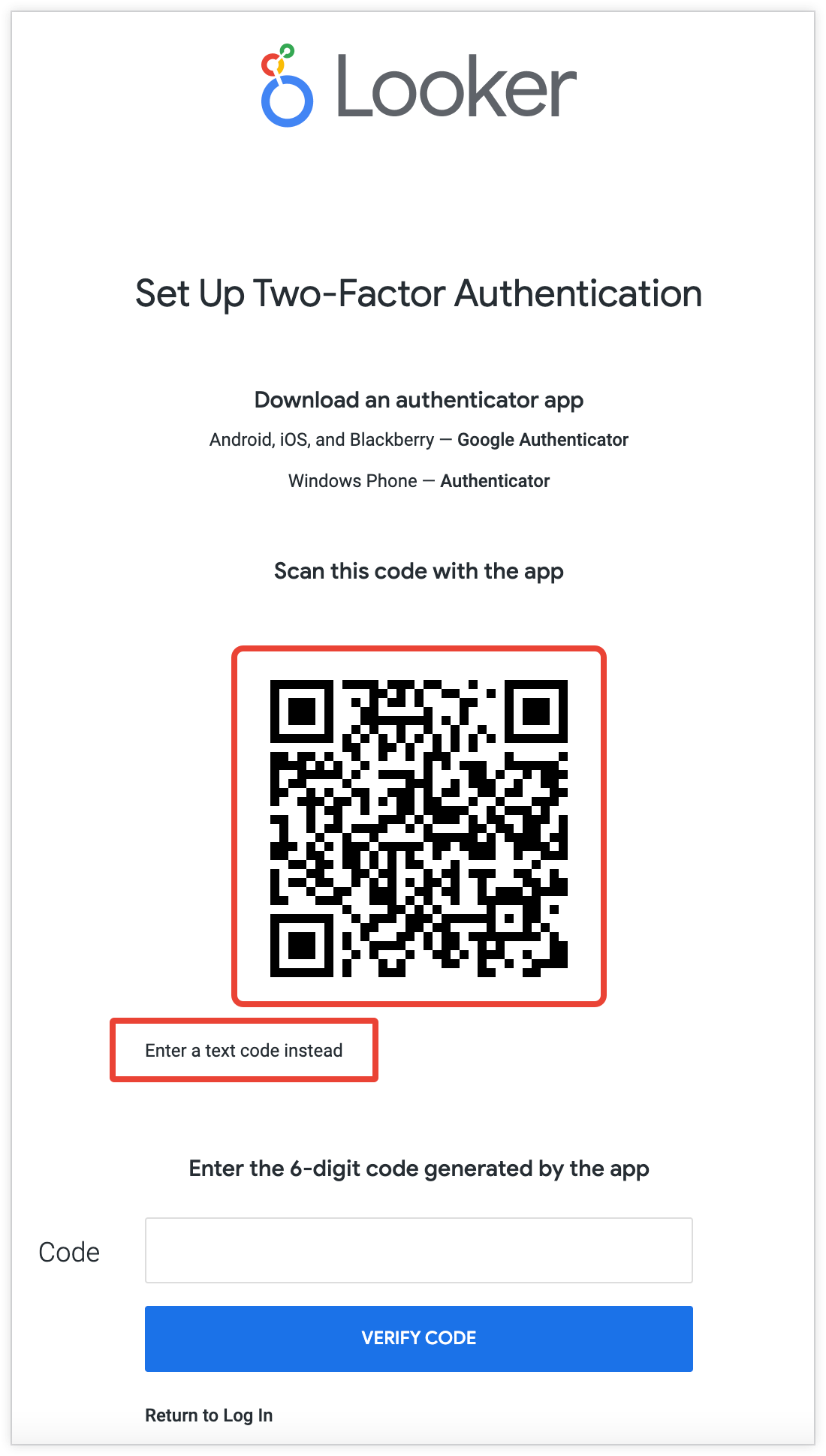 Looker menyediakan autentikasi dua faktor (2FA) sebagai lapisan keamanan tambahan untuk melindungi data yang dapat diakses melalui Looker. Dengan 2FA diaktifkan, setiap pengguna yang login harus melakukan autentikasi dengan kode sekali pakai yang dibuat oleh perangkat seluler mereka. Tidak ada opsi untuk mengaktifkan 2FA bagi sebagian pengguna.