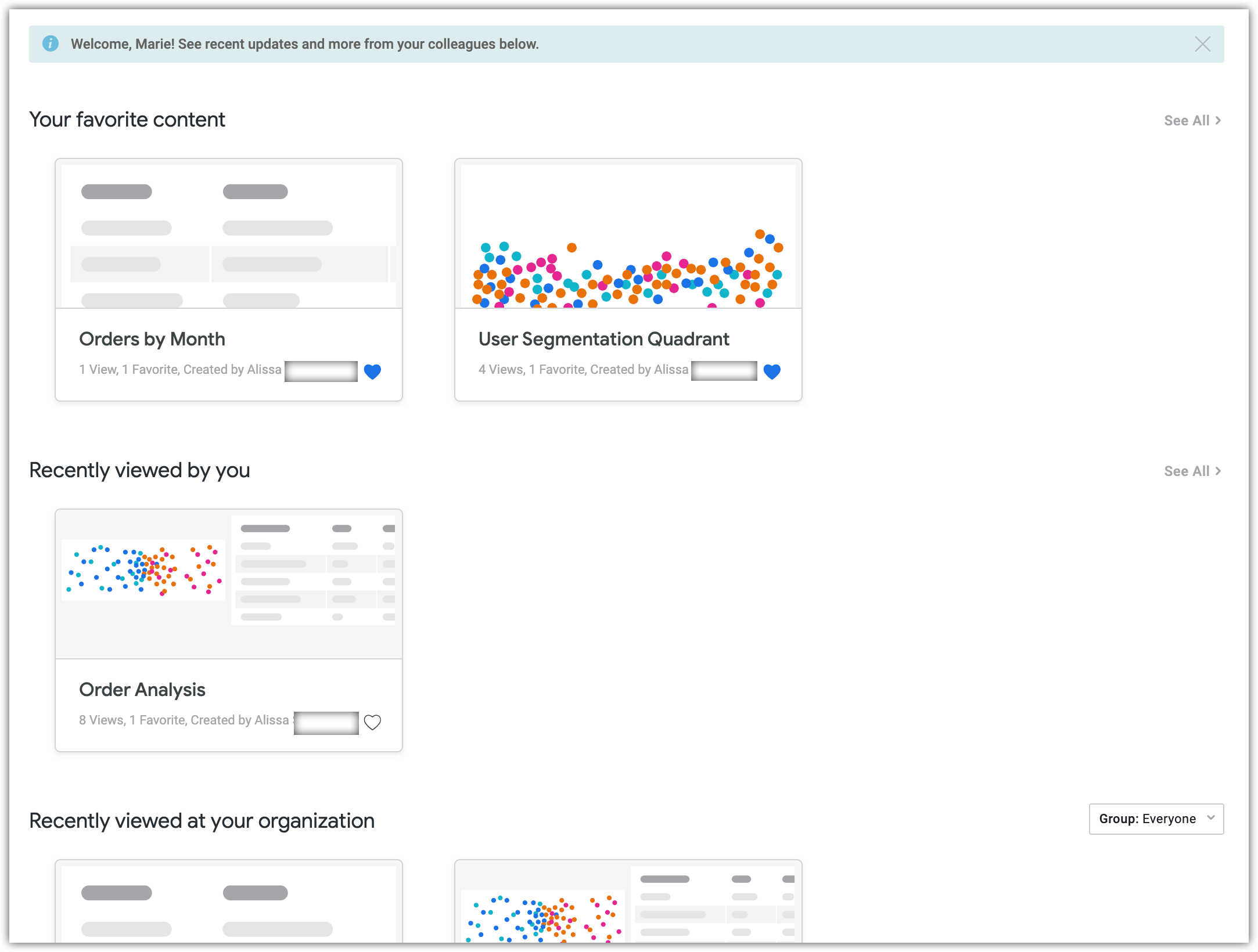 Vordefinierte Startseite von Looker: Auf der vordefinierten Startseite von Looker werden Tabs für zuletzt angesehene und als Favoriten markierte Inhalte angezeigt. Das ist die Standardeinstellung.
