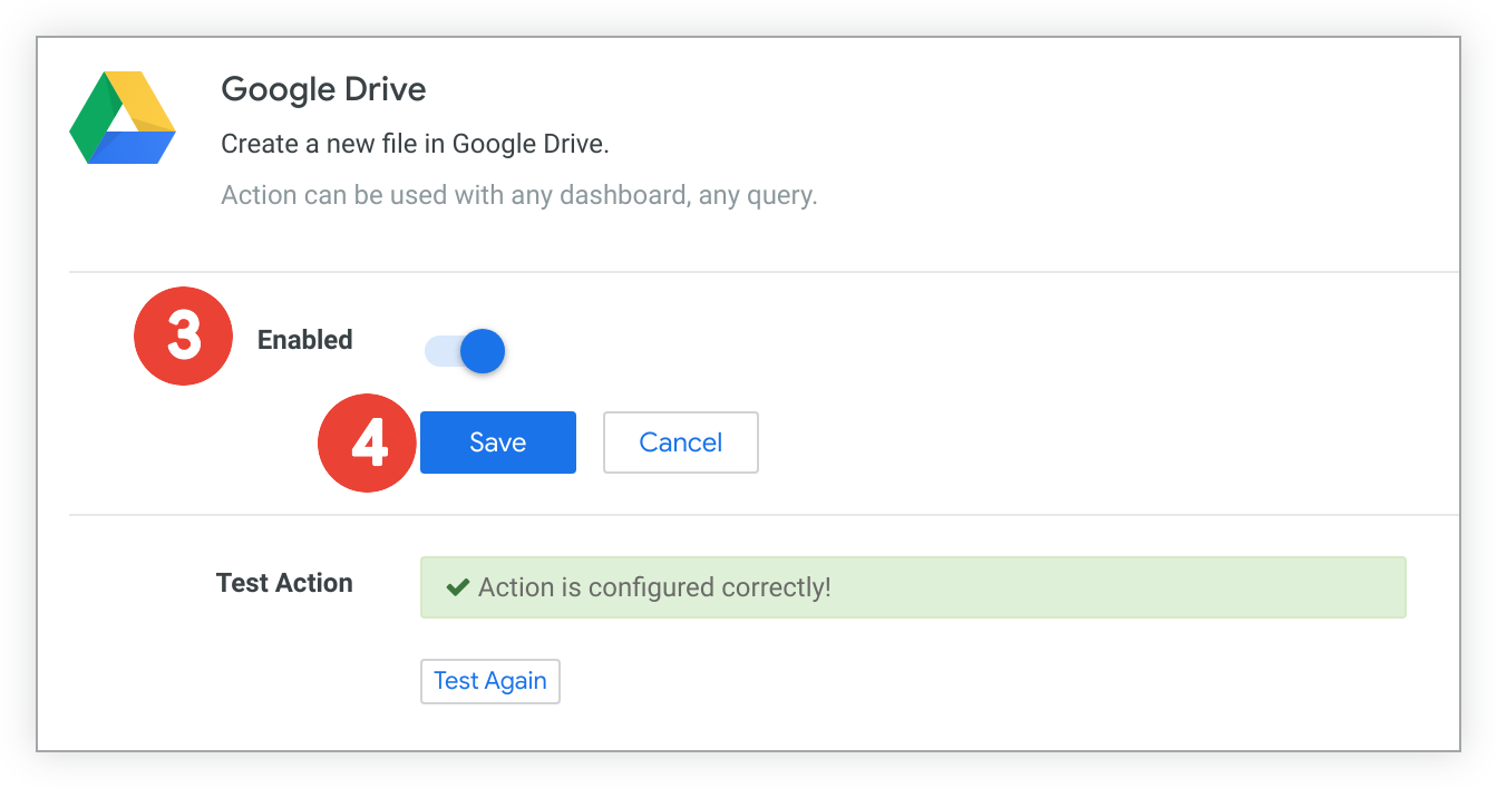 Ative o switch Ativado. O Looker testa automaticamente a configuração da ação e apresenta um erro se a ação estiver configurada incorretamente. Depois de fazer alterações, selecione Testar novamente para testar novamente a configuração da ação.