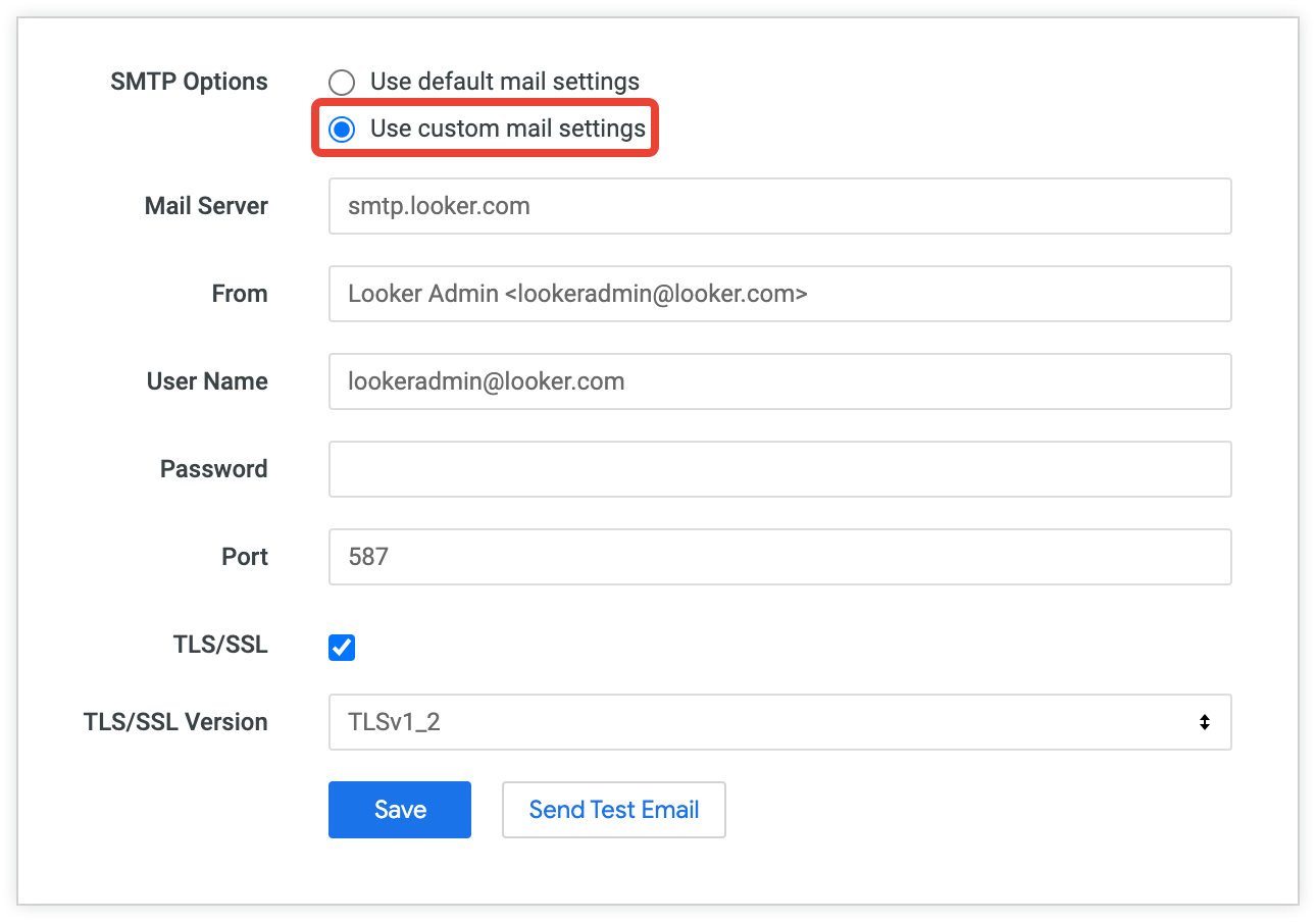 TLS/SSL: se il server SMTP utilizza i protocolli TLS o SSL per email più sicure, seleziona questa opzione. Looker mostra un menu a discesa delle versioni TLS e SSL supportate. Seleziona la versione del protocollo. Per TLS, è consigliata la versione 1.2.