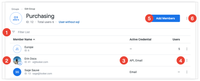 3. 如果群组成员是用户,则有效凭据列会显示用户可用于登录 Looker 的凭据类型。如果群组成员是另一个群组,则有效凭据列会显示成员群组中的用户数量。