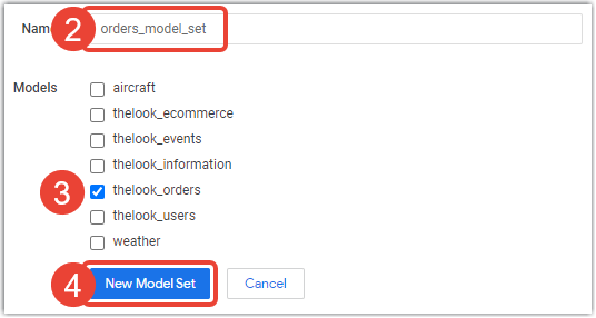 Looker에 새 모델 세트 페이지가 표시됩니다. 새 모델 세트 이름을 입력합니다.