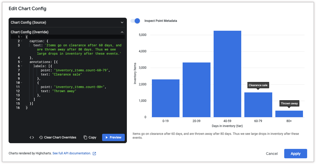 次の HighCharts JSON では、グラフに 2 つのアノテーションを追加して、一定期間経過後に在庫商品が減少していることを説明します。また、グラフの下部に、アノテーションを詳細に説明するキャプションを追加します。