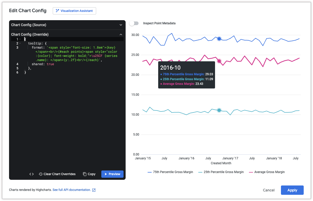 グラフ構成エディタを使用して、HighCharts API を使用する Looker の可視化の書式設定オプションをカスタマイズできます。これには、縦棒グラフ、棒グラフ、折れ線グラフなど、ほとんどのデカルトグラフが含まれます。
