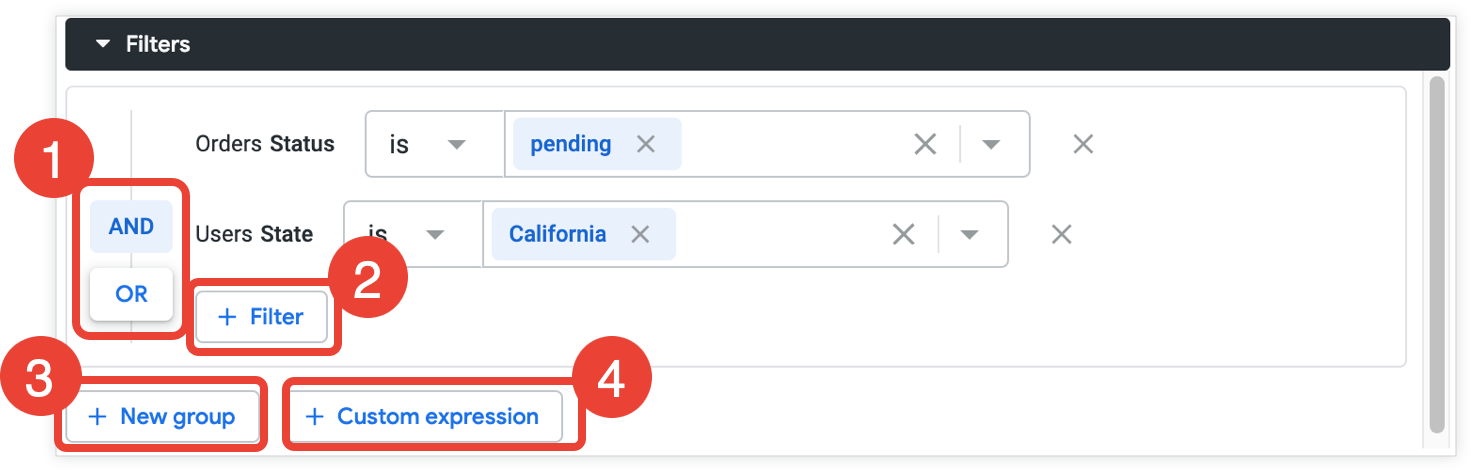 AND/OR filters appear in the Filters section in an Explore. You can customize filters with AND/OR logic when you add or edit a filter on an Explore.
