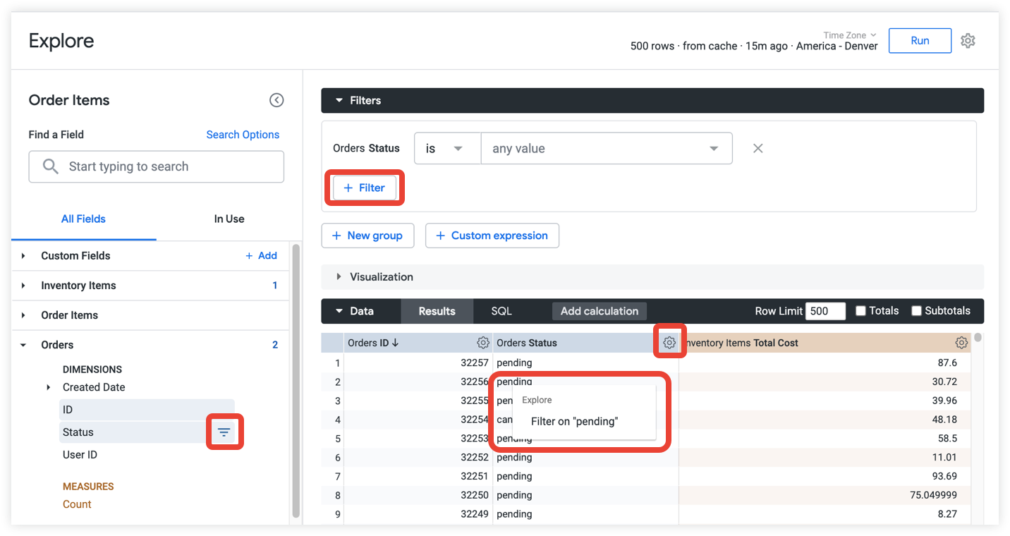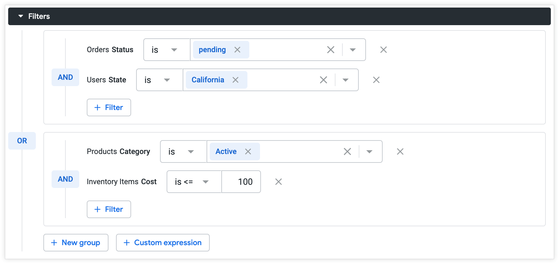 The resulting explore will show order data of pending orders in California OR orders that contain Active category goods costing less than or equal to 100.