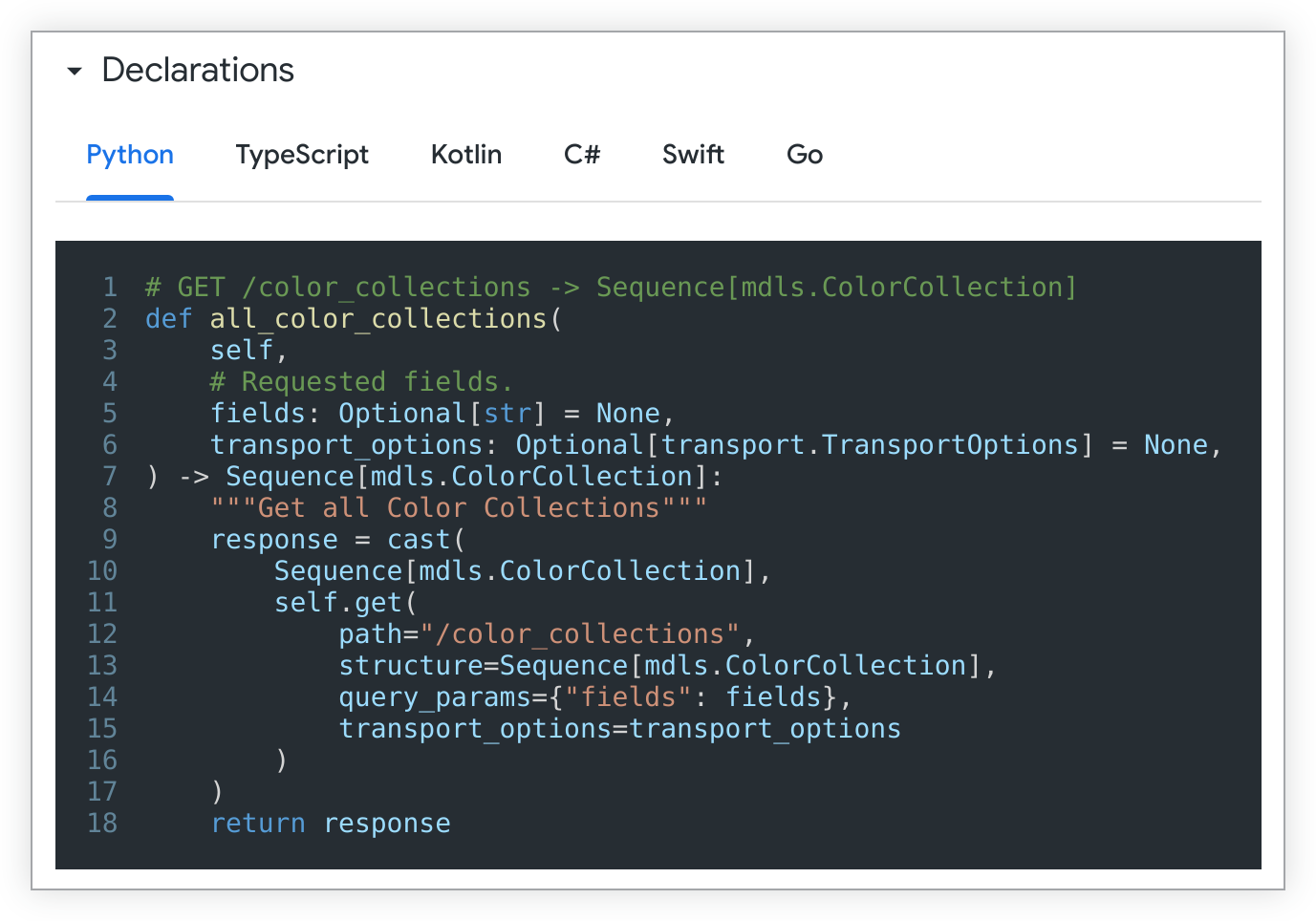 API Explorer では、SDK 言語セレクタ プルダウンで選択された SDK 言語で SDK のメソッドとタイプの宣言がレンダリングされます。SDK 言語セレクタを [All] に設定すると、メソッドとタイプの宣言が、サポートされているすべての SDK 言語でタブ区切りで表示されます。