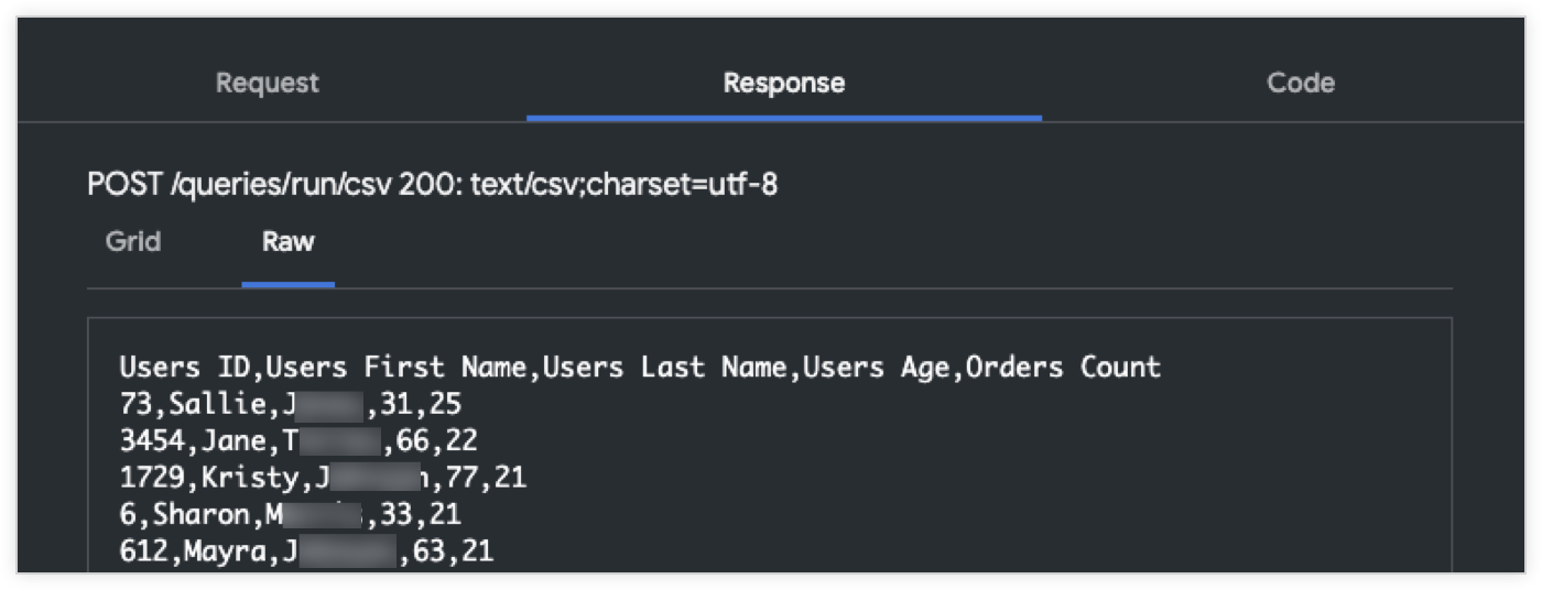 CSV 및 JSON 데이터의 경우 Looker는 형태 테스트를 수행하여 데이터가 테이블의 기준을 충족하는지 확인합니다. Looker에서 페이로드 데이터가 테이블 형식이라고 판단하면 응답의 기본 디스플레이가 데이터 그리드로 표시됩니다.
