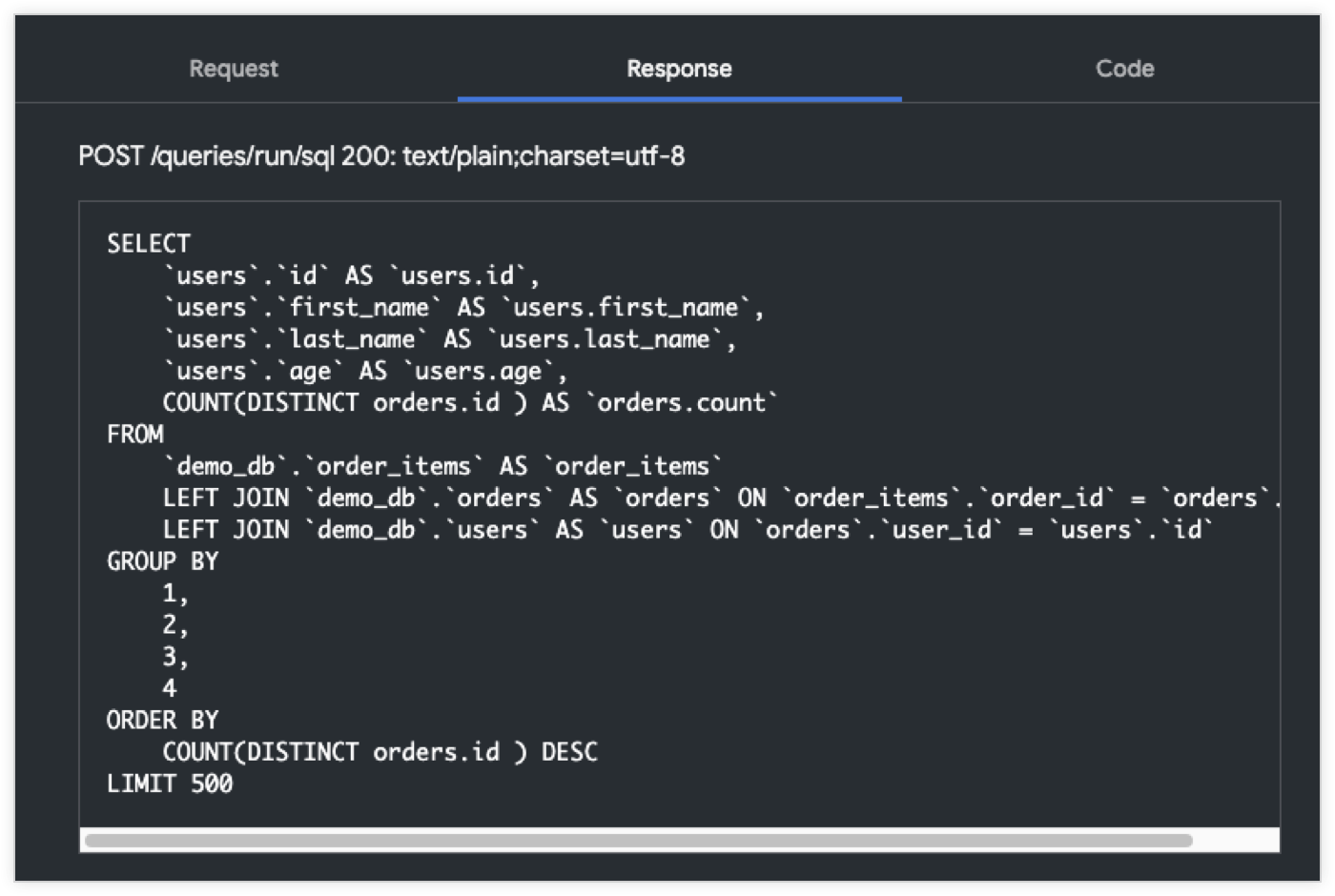 SQL을 반환하는 요청 또는 MIME 유형의 일반 텍스트로 입력된 기타 형식은 응답 탭에 일반 텍스트로 표시됩니다.