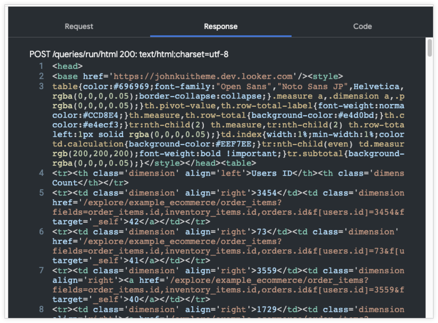 Les charges utiles JSON peuvent être sous forme de tableau, auquel cas elles s'affichent dans une grille. Les en-têtes de colonne de la requête LookML s'affichent au format <view_name>.<field_name>, au lieu d'afficher le libellé du champ.