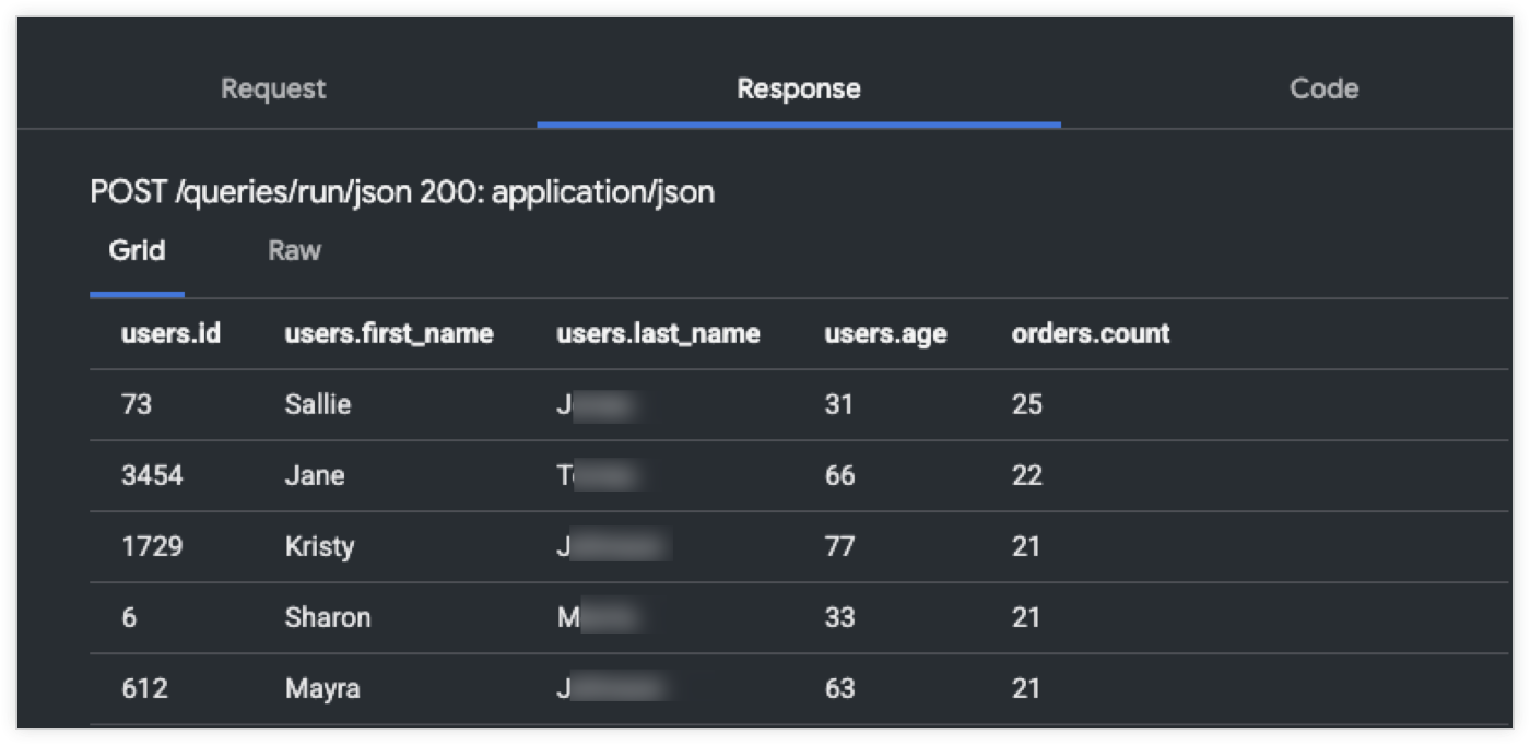 Les charges utiles JSON peuvent être sous forme de tableau, auquel cas elles s'affichent dans une grille. Les en-têtes de colonne de la requête LookML s'affichent au format <view_name>.<field_name>, au lieu d'afficher le libellé du champ.