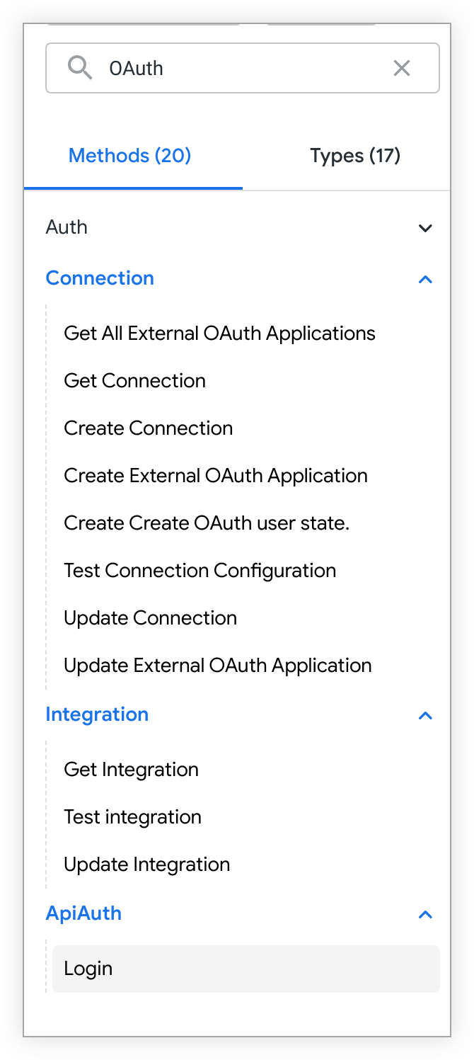 [Search] フィールドに検索キーワードを入力し、一覧表示される [Methods] と [Types] を、検索キーワードに一致するテキストを含むものだけに制限します。