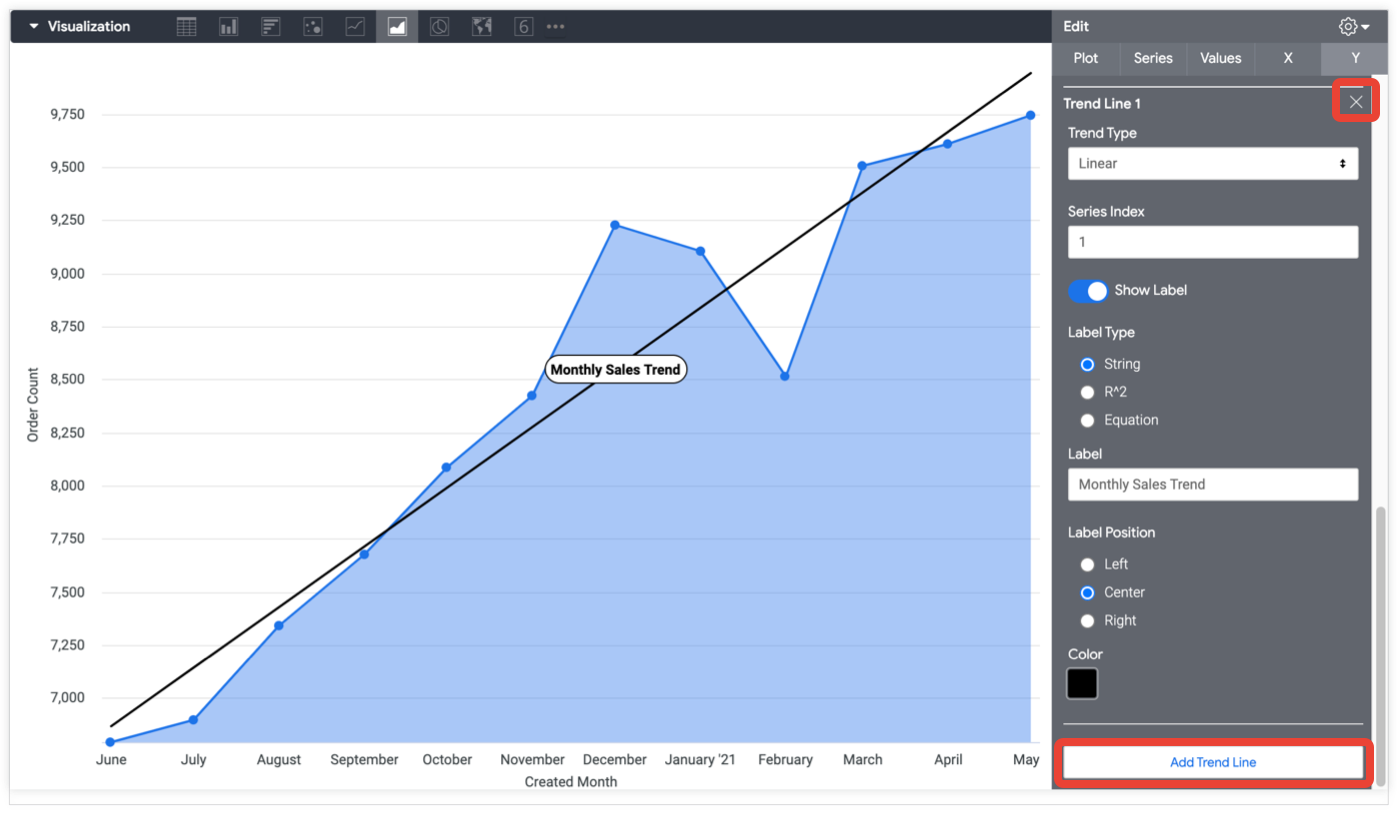 按一下「新增趨勢線」按鈕,在圖表中新增趨勢線。按一下即可新增任意數量的趨勢線,並顯示這些趨勢線的設定。如要刪除趨勢線,請按一下設定右上方的「X」X