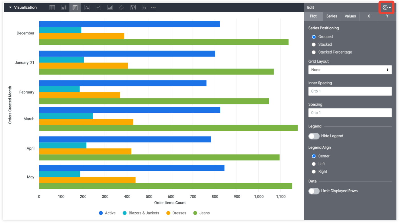 El botón Editar configuración del gráfico está disponible si tienes el rol de administrador de Looker o el can_override_vis_configpermiso.