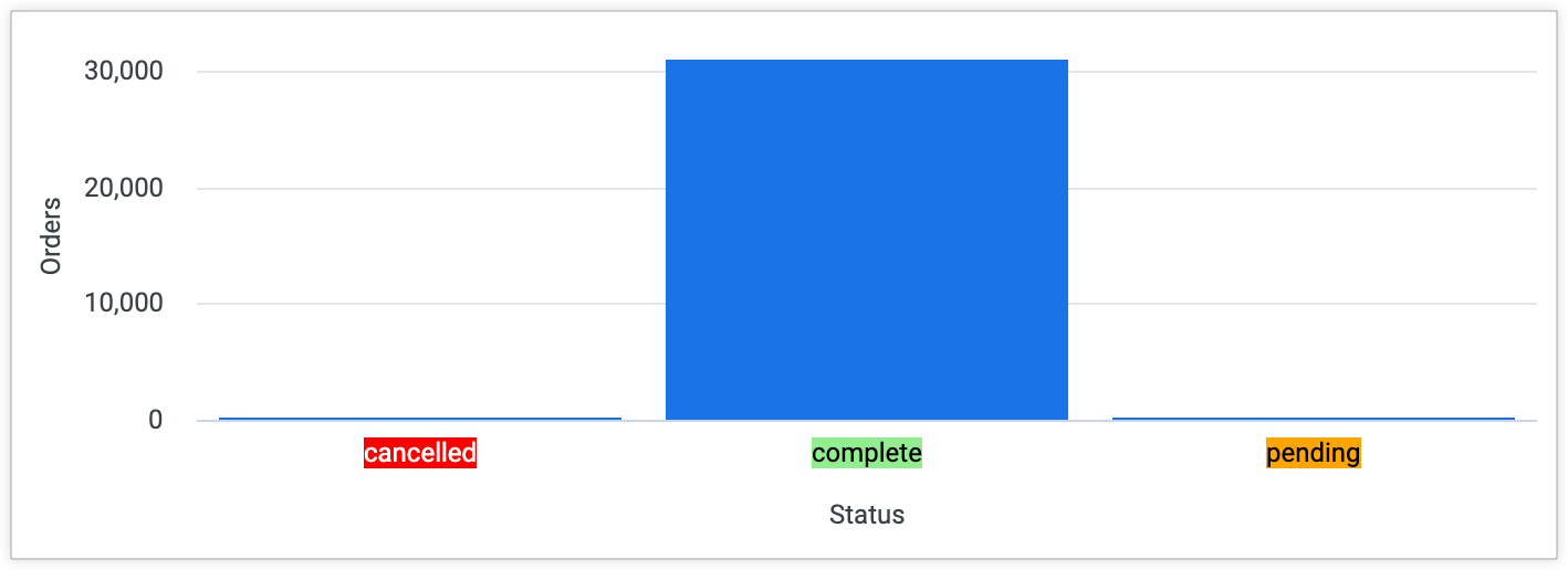 The background colors will also appear for other charts. For example, a column chart for a query that groups Orders Count by Orders Status will display the coded background colors for each Orders Status value.