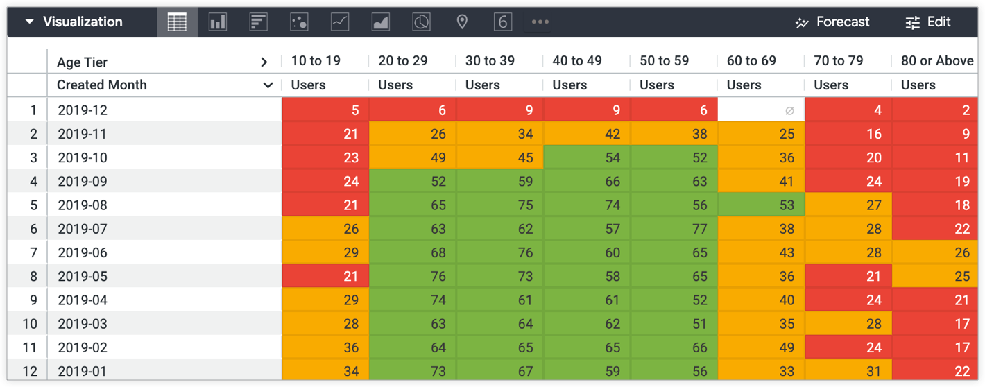 In addition to using visualization Edit menu settings, you can hardcode conditional formatting directly into a field's LookML. This is beneficial for conditional formatting that is consistent across analysis for a given field, as it avoids the need to re-configure visualization settings for individual queries.
