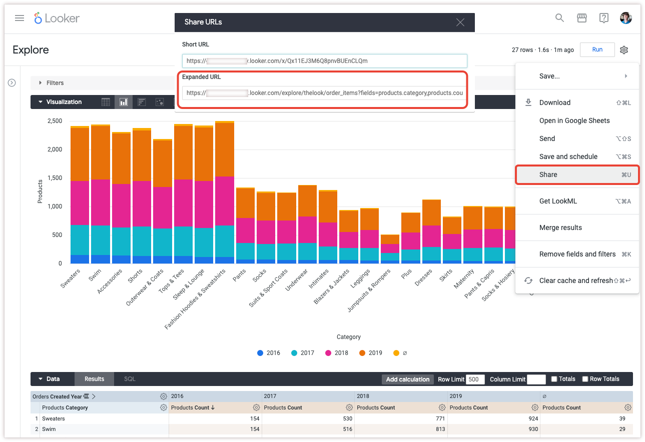 Si vous savez qu'un nom d'exploration ou de modèle a été modifié, vous pouvez corriger des présentations et des tableaux de bord individuels à l'aide de l'URL étendue. L'URL développée contient le nom du modèle, le nom de l'exploration et les noms des champs. Vous pouvez utiliser cette fonction pour modifier le nom de l'exploration ou du modèle de la requête.