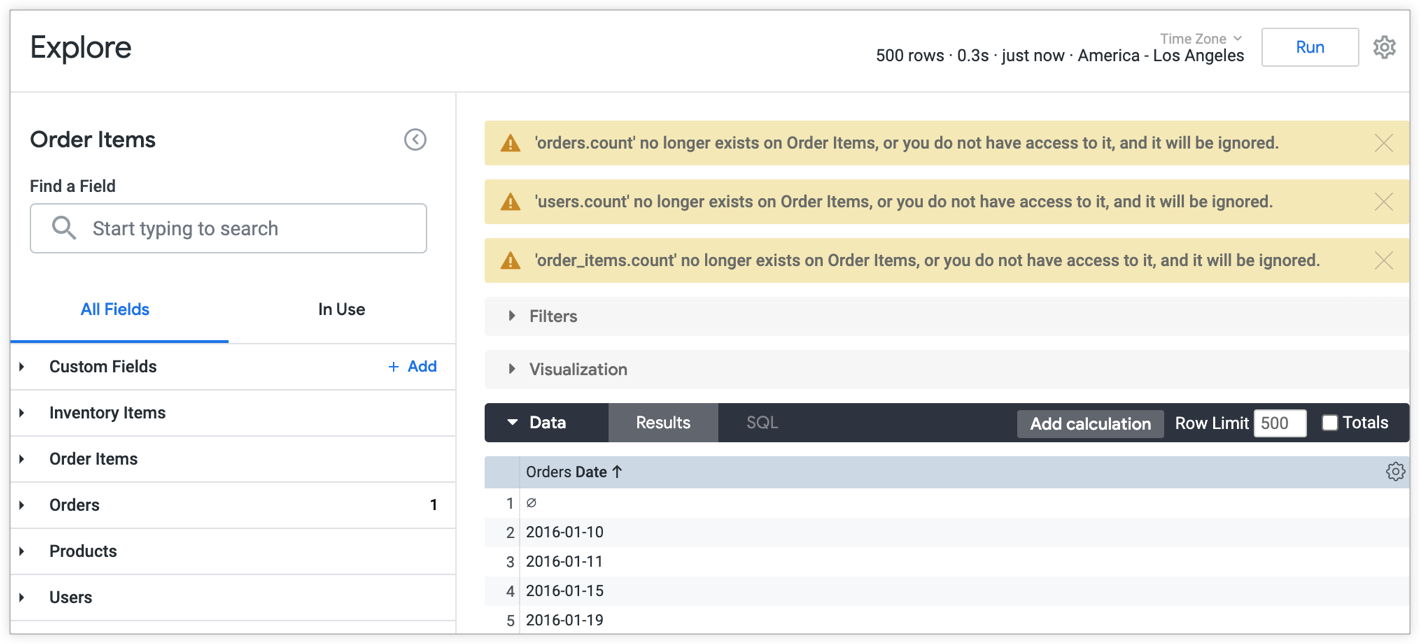 Para resolver o aviso view_name.field_name no longer exists on explore_name and will be ignored para uma análise detalhada:
