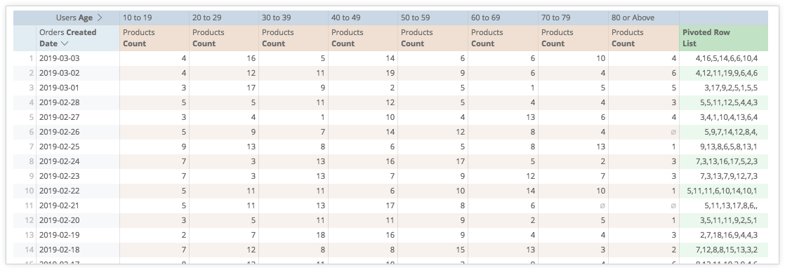 In diesem Beispiel wird die folgende Datentabelle für explorative Datenanalysen verwendet, in der die Anzahl der Produkte nach dem Datum der Bestellungserstellung gruppiert und nach dem Alter der Nutzer gepivotet wird: