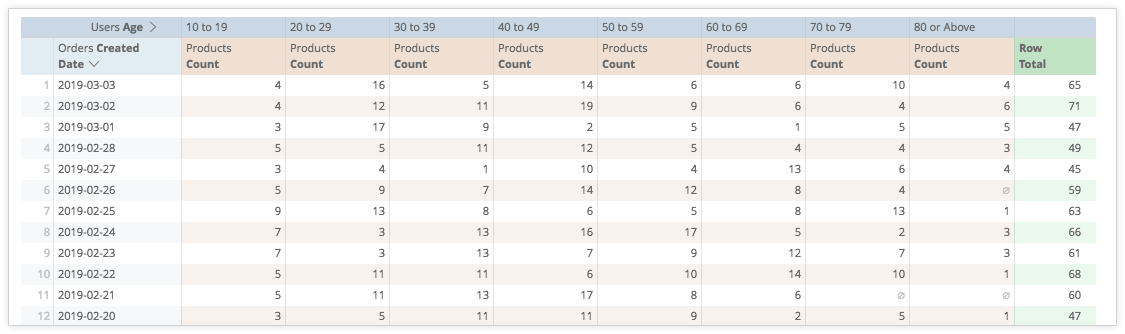 In derselben Explore-Datentabelle mit Anzahl der Produkte, gruppiert nach Datum der Bestellungserstellung und pivotiert nach Alter der Nutzer, können Sie die folgende Tabellenberechnung schreiben, um die Zeilensummen für Anzahl der Produkte auszugeben: