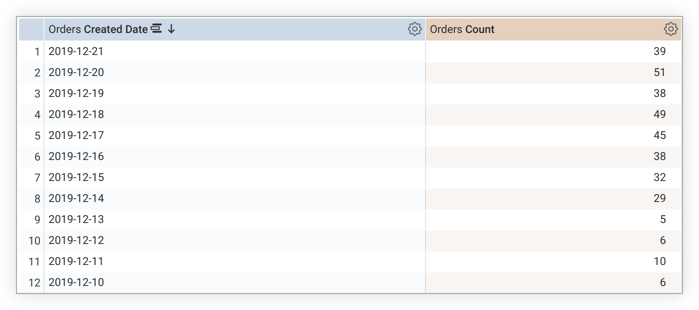 다음 예시에서는 다음 테이블의 데이터를 사용합니다. 여기에는 주문 생성 날짜별로 그룹화된 주문 수가 포함됩니다.