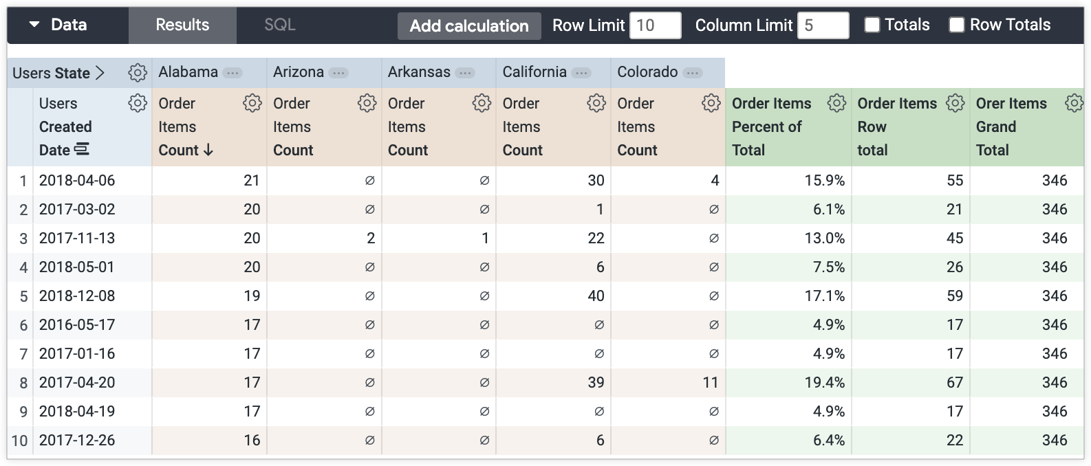 次の Explore(注文アイテム数を作成日でグループ化し、ユーザーの州でピボット)は、合計表計算に対する割合の各部分の計算を表示しています。