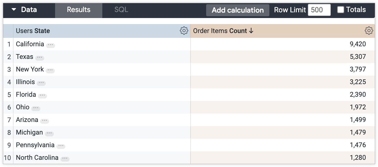 たとえば、次の Explore は、ユーザーの州でグループ化した注文アイテム数を表示しています。