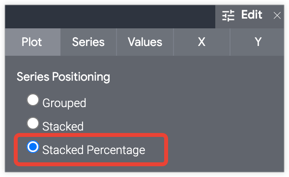 Explore の [可視化] バーにある [編集] メニューの [プロット] タブで、[積み上げ割合] オプションを選択します。
