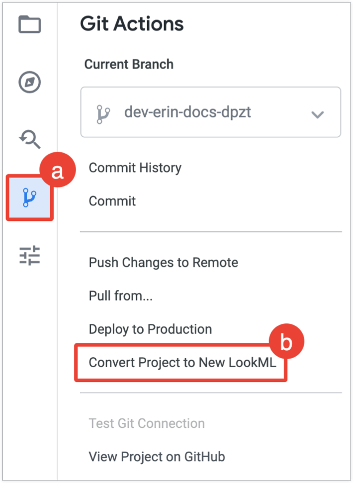 1. 在 Looker IDE 的導覽側欄中選取「Git Actions」圖示。