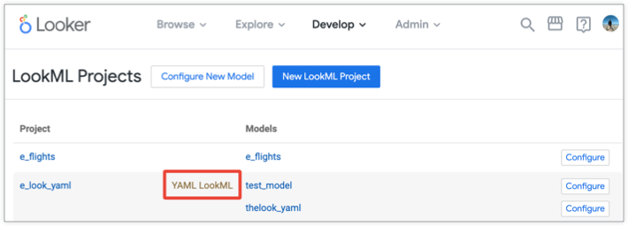 2. 在「LookML 專案頁面中,找出專案表格資料列中的「YAML LookML」標籤: